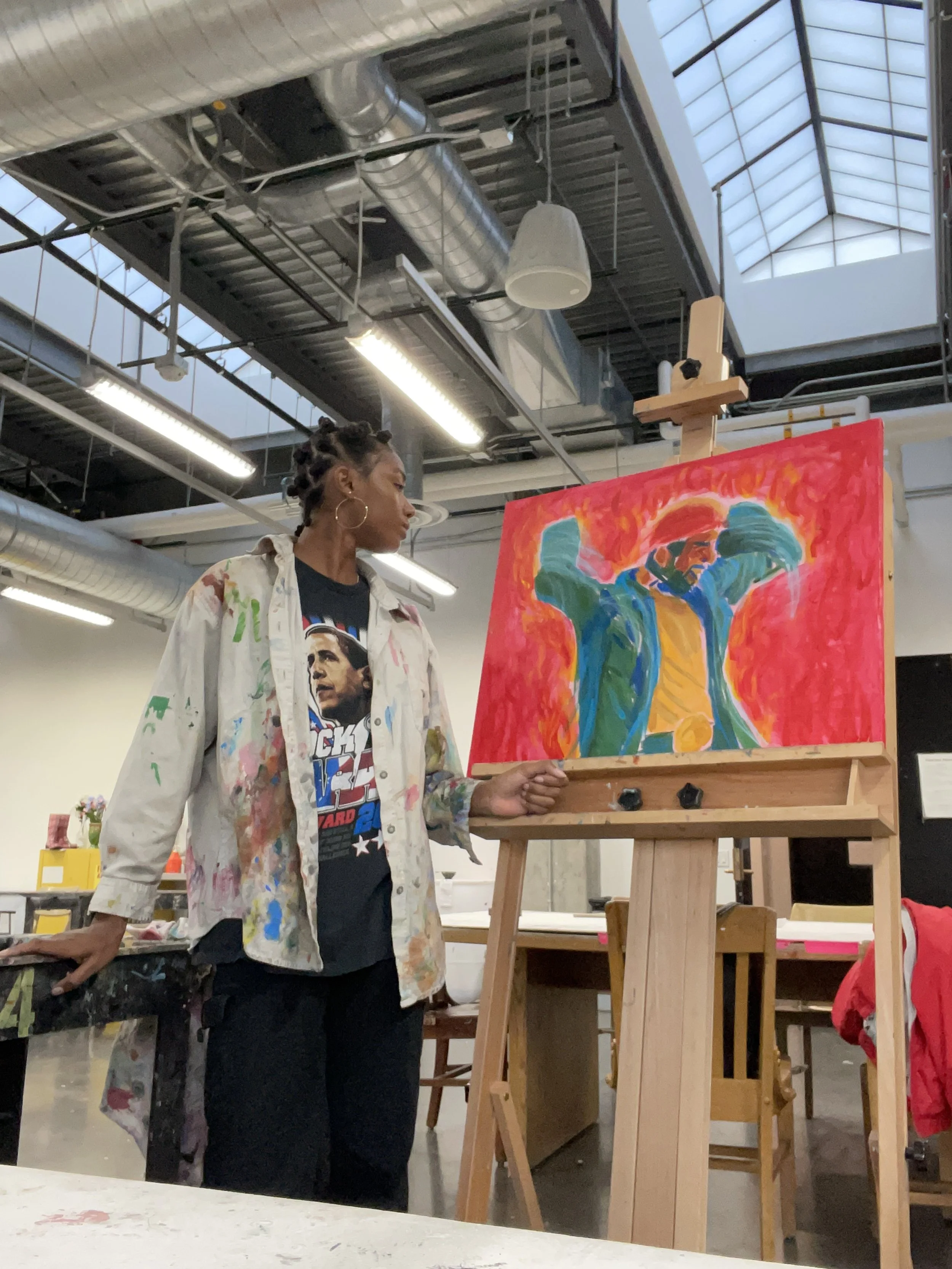 Acrylic paint and oil pastels on stretched canvas