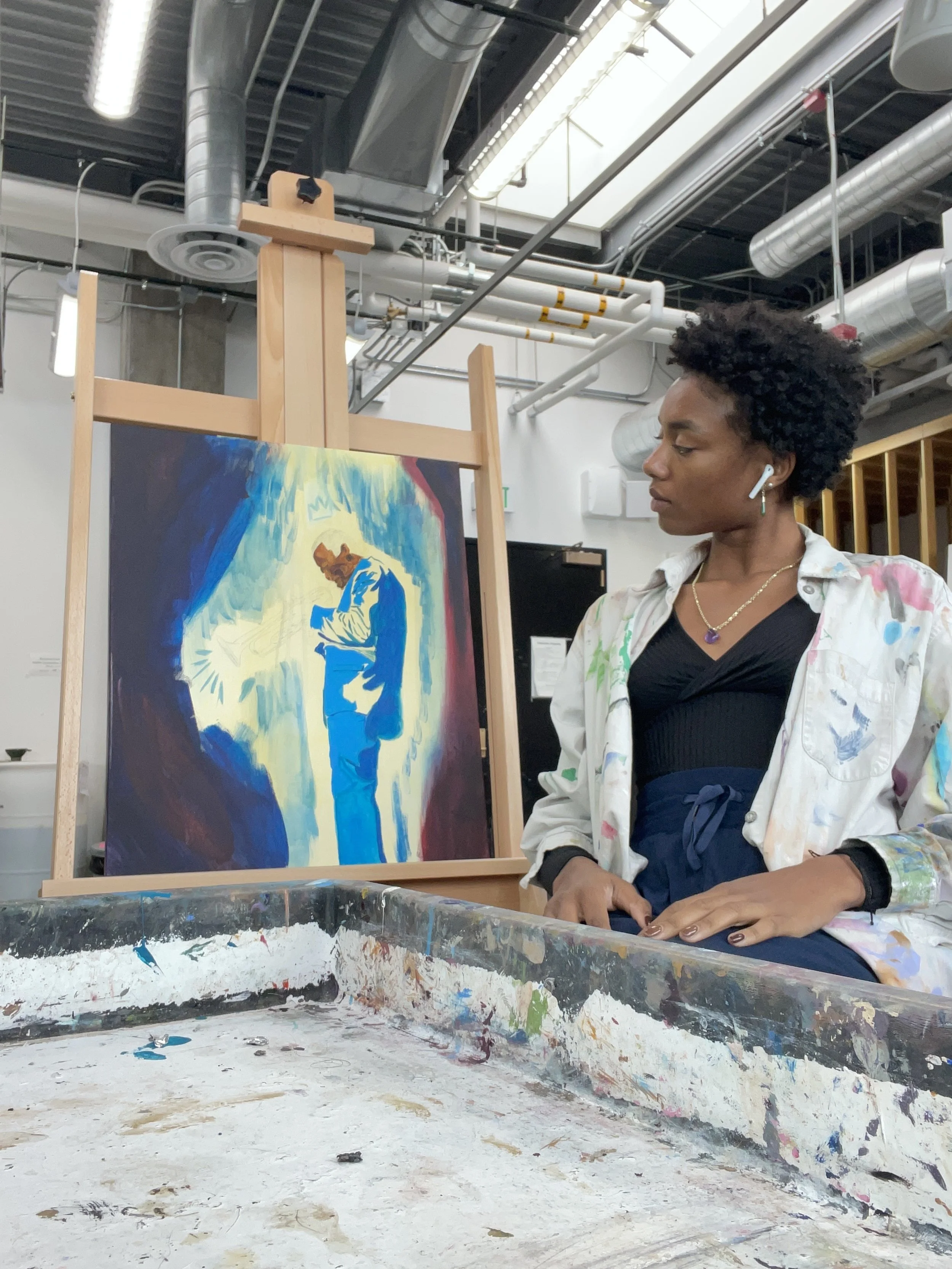 Prince of Darkness depicts the relationship between Black American music and the pains of oppression. By choosing iconic jazz musician, Miles Davis as the main subject, this piece shows how jazz played a role in liberating black people from the dark side of America. As his figure sits in the center of darkness, his music offers light that will guide others to a brighter future. Further inspired by Quincy Troupe’s novel Miles and Me, elements of his research played a large role in creating this work of art.